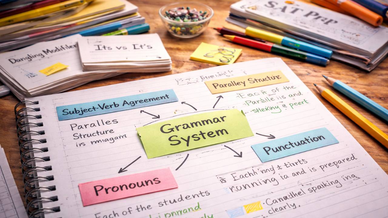 The College Board tests approximately 12 to 15 grammar questions within the Reading and Writing section, drawing from four content domains: Craft and Structure, Information and Ideas, Standard English Conventions, and Expression of Ideas. These questions assess whether students can recognize and apply grammatical patterns in context, not whether they can recite definitions. The most frequently tested concepts include verb consistency, pronoun agreement, parallel structure, modifier placement, punctuation conventions, and idiomatic expressions. Each represents a systematic aspect of how English conveys meaning through structure.